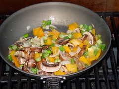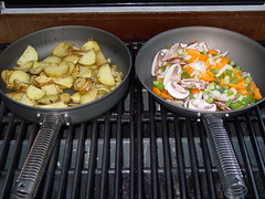 In a seprate pan, heated on the grill, at about 30 minutes into the potato cooking time add the yellow bell pepper, green onion, crimini mushroom and yellow onion. I didn't add any oil to cook in as I basically wanted to just cook these slightly. The new “Man Pans” didn't require any. Another pinch or so of salt and pepper here also. I wouldn't cook the vegetables more than 8 – 10 minutes.