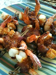 Take a shrimp and wrap a piece of bacon around it, slid it gently onto a small skewer. I do two per skewer and use two skewers. Drizzle on your favorite sauce, for me it was Caribbean Spice sauce from All Spice Cafe this time.