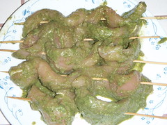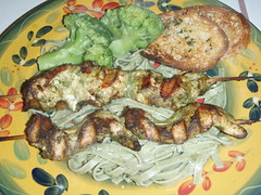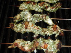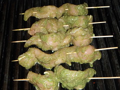 As you all know I am all about basic, fast and easy cooking. I want my food to taste good and look good, all cooked on a grill or in a Dutch oven. But sometimes I am even more lazy than ever so my mindgoes a searching for fast and this dish is fast if you don't count the marinating time. You only need three items – Pesto, Bamboo skewers and Chicken tenders, well a ZipLoc bag will help also.