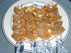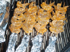 Shrimp were skewered after marinating for 30 minutes (soak your bamboo skewers in water at the same time). I wrapped the ends of the skewers with foil to keep them from burning. Cook time 5 minutes.