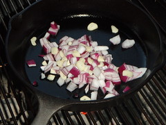 Cooking the rice was just as easy and all you need is a Cast iron skillet for the grill (if you want). I use Cast iron on my grills all the time, just think of your grill as a stove top and it opens up a whole new world of possibilities. Chop up some red onions and garlic then saute them in the skillet over coals until just tender with some olive oil. Take a double layer of foil and make a pouch, add your rice, water, onions and garlic. Seal tight and cook for 15 – 20 minutes. Yep, that easy.