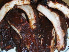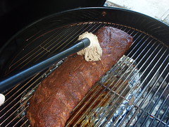 Most mops include a blend of water and vinegar to help tenderize your meat, plus many other combinations of spices, juices, beer, liquid smoke, etc. Mopping is applied on a regular basis during the cooking process. Use a Mopping brush, it look like a mini kitchen mop. Mop sauce is dribbled on the ribs liberally.