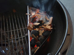 Smoke needs to be applied during this critical cooking period. Apply soaked wood chips or chucks, they come in many different wood types. Hickory, Cherry and Mesquite are great choices for ribs.
