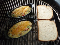 Cook with indirect heat for approximately 15 minutes at 350° Side dishes, yes I had to have my bacon and toast with my meal, basic requirements as you know. Bacon is really easy on the grill, direct heat with any size Cast Iron skillet will get the job done. I have found through experimentation that a “ribbed” Cast Iron skillet works best. Keeps that burning grease away from the bacon! That is important because the bacon cooks really fast on the grill; you’re frying and baking at the same time. I know that sounds strange but you will know what I mean when you try it and watch out when you remove that skillet!! Hot!! A 350° skillet full of hot grease is worthy of respect, use thick leather glove to remove any Cast Iron from your grill.