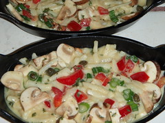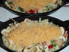 Scramble eggs and milk together in a bowl then add all the other ingredients (except the cheeses) together and mix. Take your Cast Iron pan (2) grease well and pour in mixture. Keep in fridge until barbecue is ready to go.