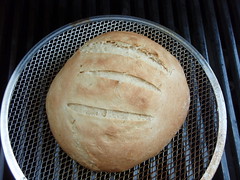 Preheat BBQ to about 375 degrees, place dough on baking grid or sheet. Using in-direct heat place dough into center of BBQ. Bake for about 40 minutes. Try not to peak, just use your nose, it's the same with Dutch oven cooking. When done (The bottom should go thump when you tap it) set out to cool as long as you can stand to wait!