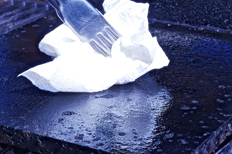 After cooking, while still hot (burners turned off if using a gas grill): Take a wadded up paper towel, grasp with a pair of tongs and remove the excess grease and food particles from the Island Grillstone.