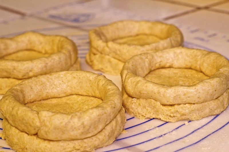 Using the dough from between the biscuit I just cut out, roll the dough into rings to place on top of the biscuits.