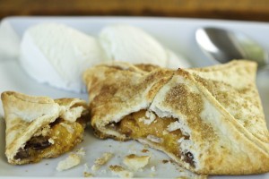 Using prepared pie dough or homemade pie dough, cut four 6 inch squares.