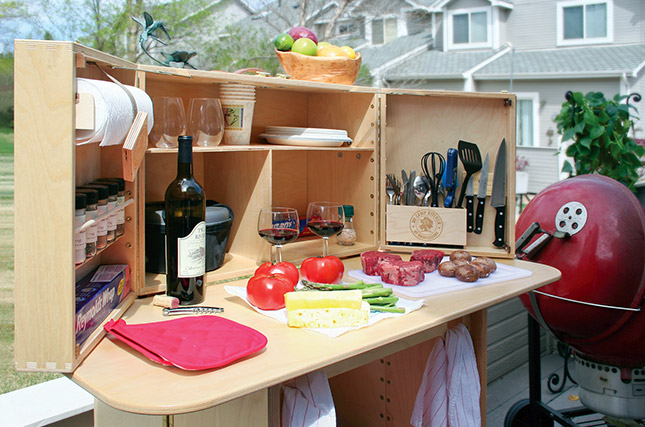 Outdoor camp kitchens that act as a storage unit and work station. High quality wood craftsmanship perfect for the Camp cook, RV'r, Backyard griller and Dutch oven cook.