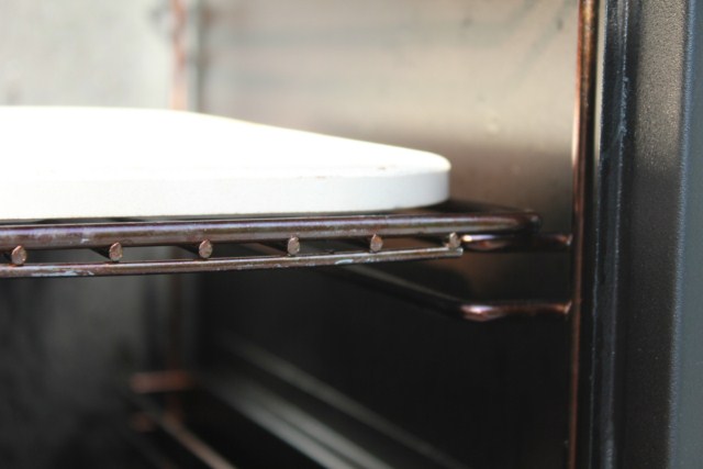 Removing all of the racks but one, I placed my rectangular pizza (12″ x 15″) stone on the remaining rack which resulted in a perfect fit.
