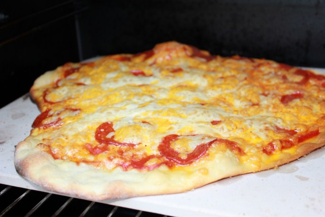 Pepperoni for the boys, of course! This was a full 12″ pizza. I should have rolled out a rectangular shaped pizza, oh well!