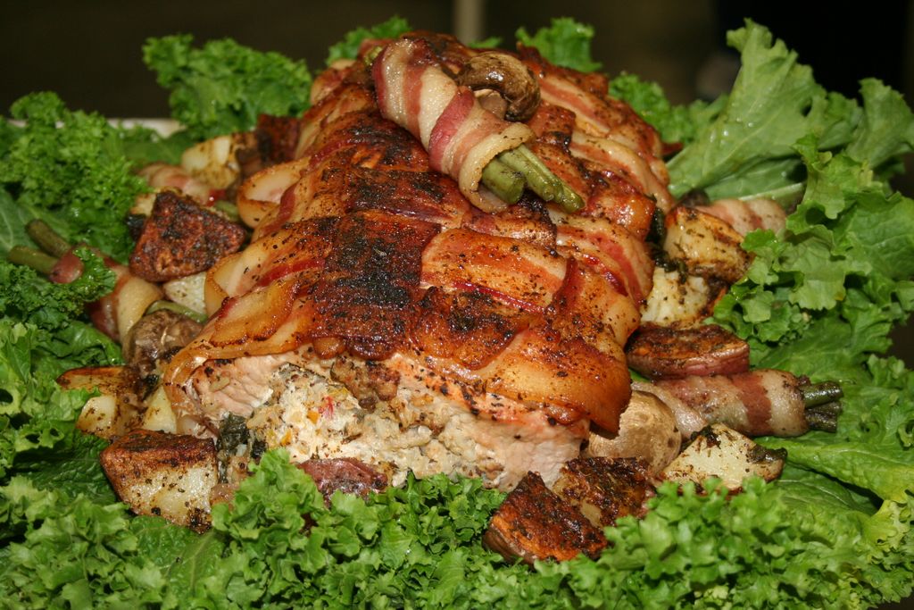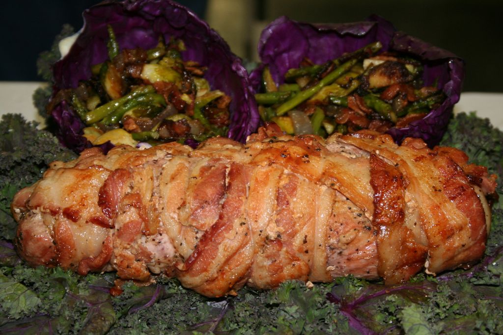 - Bacon Wrapped Pork Tenderloin with Sauteed Vegetables