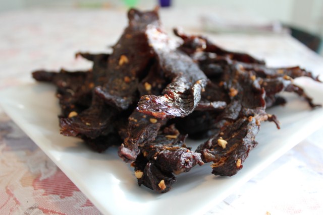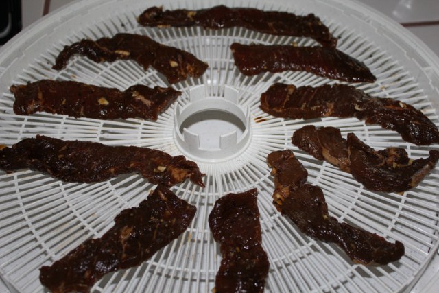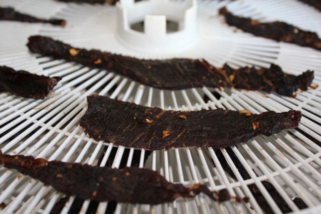 It was a simple process to slice, marinade and deploy the jerky onto the dehydrator. I marinated the jerky for 24hrs, placed it on the trays, set the temp to 160° F for 8 hrs and walked away (after I placed the dehydrator outside).
