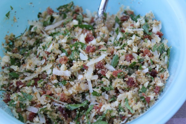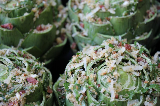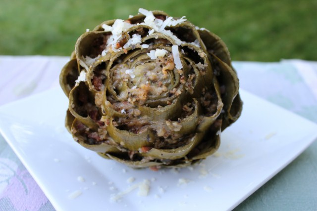 The Stuffed Artichoke stuffing recipe includes: Bacon, bread crumbs, garlic, parsley, Romano/Parmesan cheese and olive oil. The recipe is below.