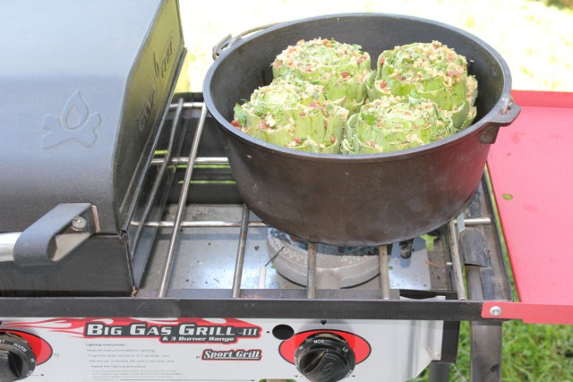 Now for you die hard Dutch oven purest out there, feel free to use charcoal to boil the water and steam those Artichokes. It can be done, but, well lets just say “I have been there and done that”, now prefering to use a nice stove such as the Camp Chef Big Gas Grill with 30,000 btu's to do the work for me.