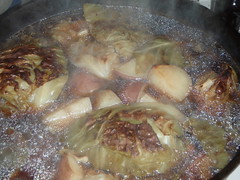 Brisket on bottom of Dutch, dump everything else, except potatoes and cabbage on top and cook for 1 – 1/2 to 2 hours! Add potatoes and cabbage for the remainder of time. It will fall apart!