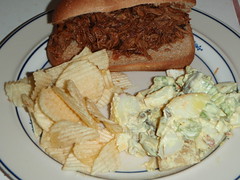 Pull your Pork into shreds and add your favorite BBQ sauce, pile it on a bun with some Potato Salad and chips. Yummy!!!