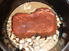 Rub? Marinade? Injector? Salt and pepper with a prayer? Rub won, so I started to look for just the right rub and couldn't find it. Well, i'll just mix something up and it will be great, right? I took part of an recipe here and there and rubbed up my Pork Roast. I added some stuff to the bottom of the Dutch oven placed my roast in it and of course, some beer!!