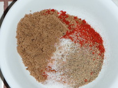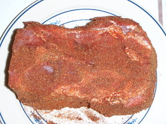 Coat with olive and mix rub together (Brown sugar, pepper, chili powder, salt, paprika, cayenne pepper, cumin). Rub the Pork all over and let sit for a couple of hours.