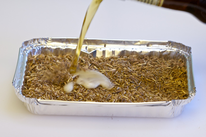 Place the wood chips in a small, shallow dish and add lager to cover.