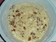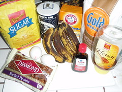 Mix everything except the banana's and pecan's. Mix till moist, then add your banana's and pecans. Pour into a greased loaf pan.