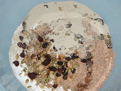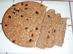 Note: I added a seed and raisin mix instead of using the recipe seeds and poured some on top of the loaf before baking. This is a fairly dense loaf and tasted great with a little butter and honey on it. If you let it rise to sandwich bread height (I didn't) it will be a fantastic sandwich bread for wheat lovers. Last point, if you peak during the baking process you will lose some height. Yep I peaked, I was multitasking the family and forgot my start time, peaked and got some plop. No matter it is still a great bread.