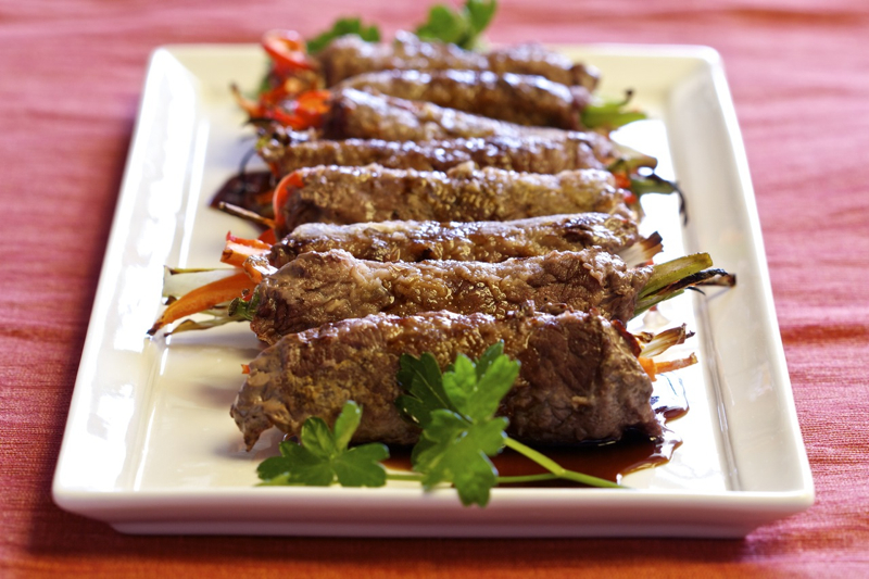 - Secure the beef rolls with toothpicks, soaked in water to prevent them from burning, and cook on medium heat grill, or in a pan over medium heat, (or on your Island Grill stone) until golden brown and thoroughly cooked.