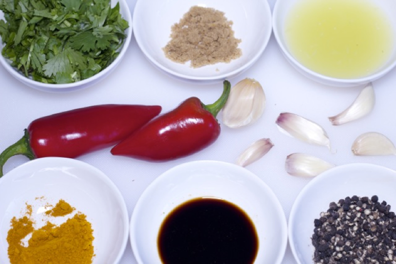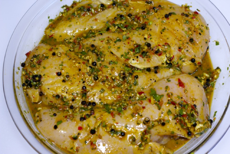 Note: I added one red chilli to the marinade and I used whole peppercorns (I should have crushed the peppercorns before adding to food processor)