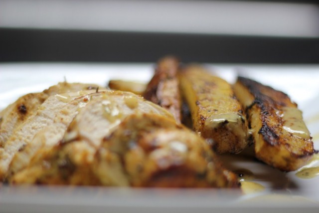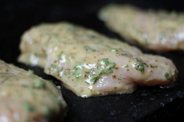 To prepare the marinade, first purée the garlic in a food processor. Add the grainy mustard, honey, Dijon, Greek seasoning, lemon pepper, salt and pepper. Pulse a few times to blend. Then add the lemon zest and fresh lemon juice. Keep the food processor running while you slowly add the oil. Do not over mix. The consistency should be thick but still pourable.