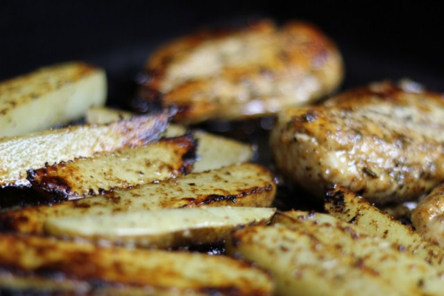 The marinade is perfect from the grill, it caramelizes up quickly from the sugar content so grill over a two zone fire or use and Island Grillstone to control flare-ups and burning. A two-zone fire will allow you to move the chicken/potatoes off of the heat and over to a cool zone if it flares up or has caramelized enough.