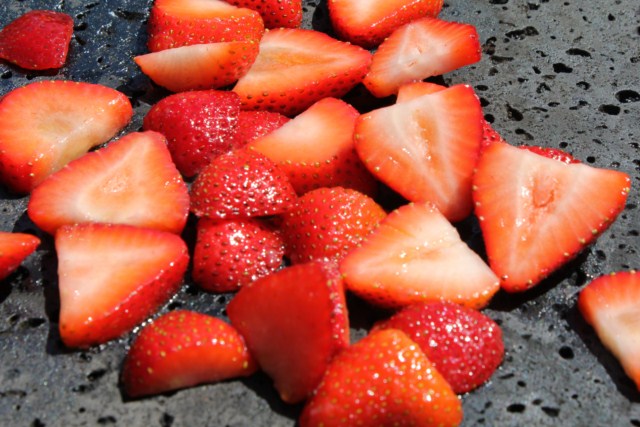 Grill set to medium Toss strawberries with oil and salt, then spread on a grillstone and roast for 12-15 minutes. Remove & set aside.