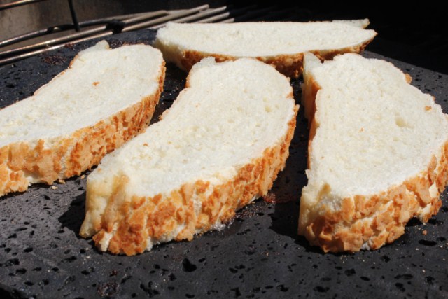 Cut some nice thick slices of french bread, I used Dutch Crust for the texture. Spread butter on one side and place on the Island Grillstone to grill. I waited for about 5 minutes before I started to add the remaining ingredients.