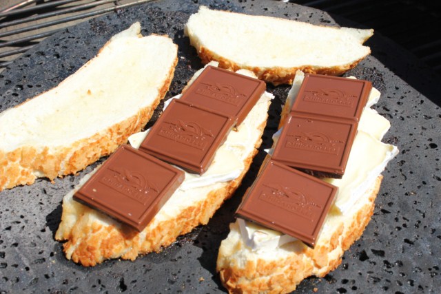Add a layer of brie and chocolate to the uncooked side of the french bread. At this point I could hear the gardeners next door making comments about how good the BBQ from somewhere was smelling.