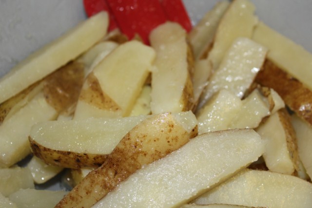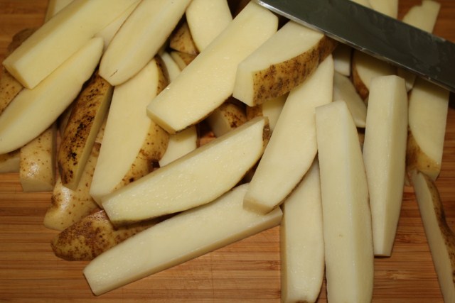 - Cut your potatoes in half, then cut in to ½" x ½" x 1" fries.